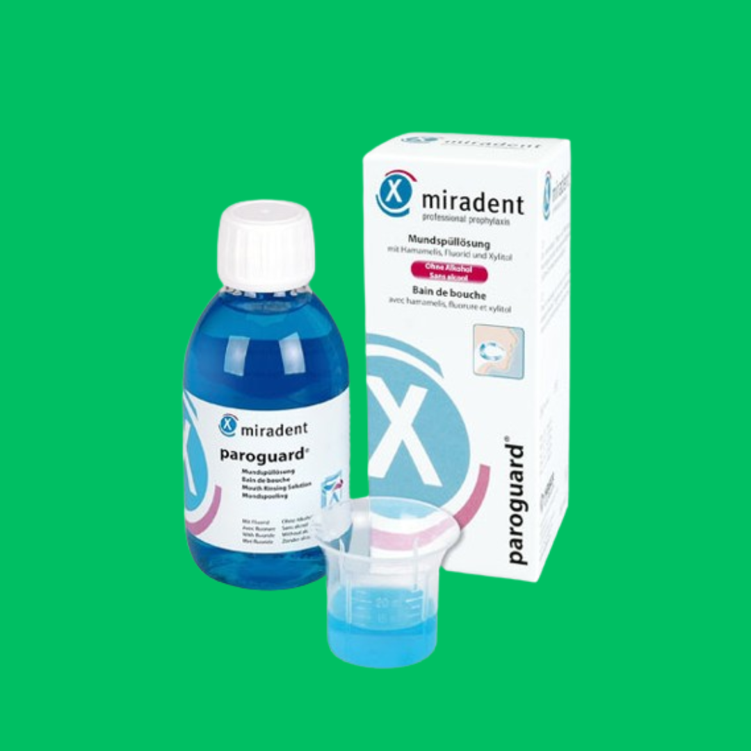 Paroguard is alcohol-free and it is gentle even to the gums and prevents irritations of the gums, mouth and throat. Guarantees a perfect and lasting nurture of the whole mouth and pharyngeal area, even in case of limited mouth hygiene capability.